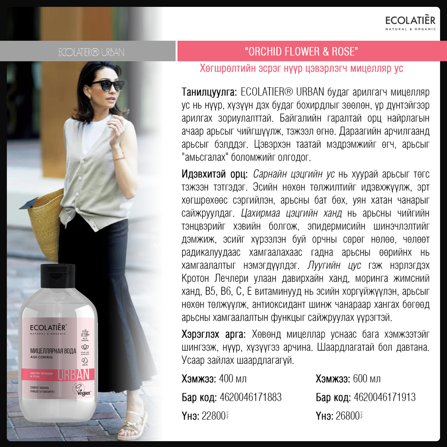 ECOLATIER® URBAN будаг арилгагч мицелляр ус нь нүүр, хүзүүн дэх будаг бохирдлыг зөөлөн, үр дүнтэйгээр арилгах зориулалттай. Байгалийн гаралтай орц найрлагын ачаар арьсыг чийгшүүлж, тэжээл өгнө. Дараагийн арчилгаанд арьсыг бэлддэг. Цэвэрхэн таатай мэдрэмжийг өгч, арьсыг "амьсгалах" боломжийг олгодог.