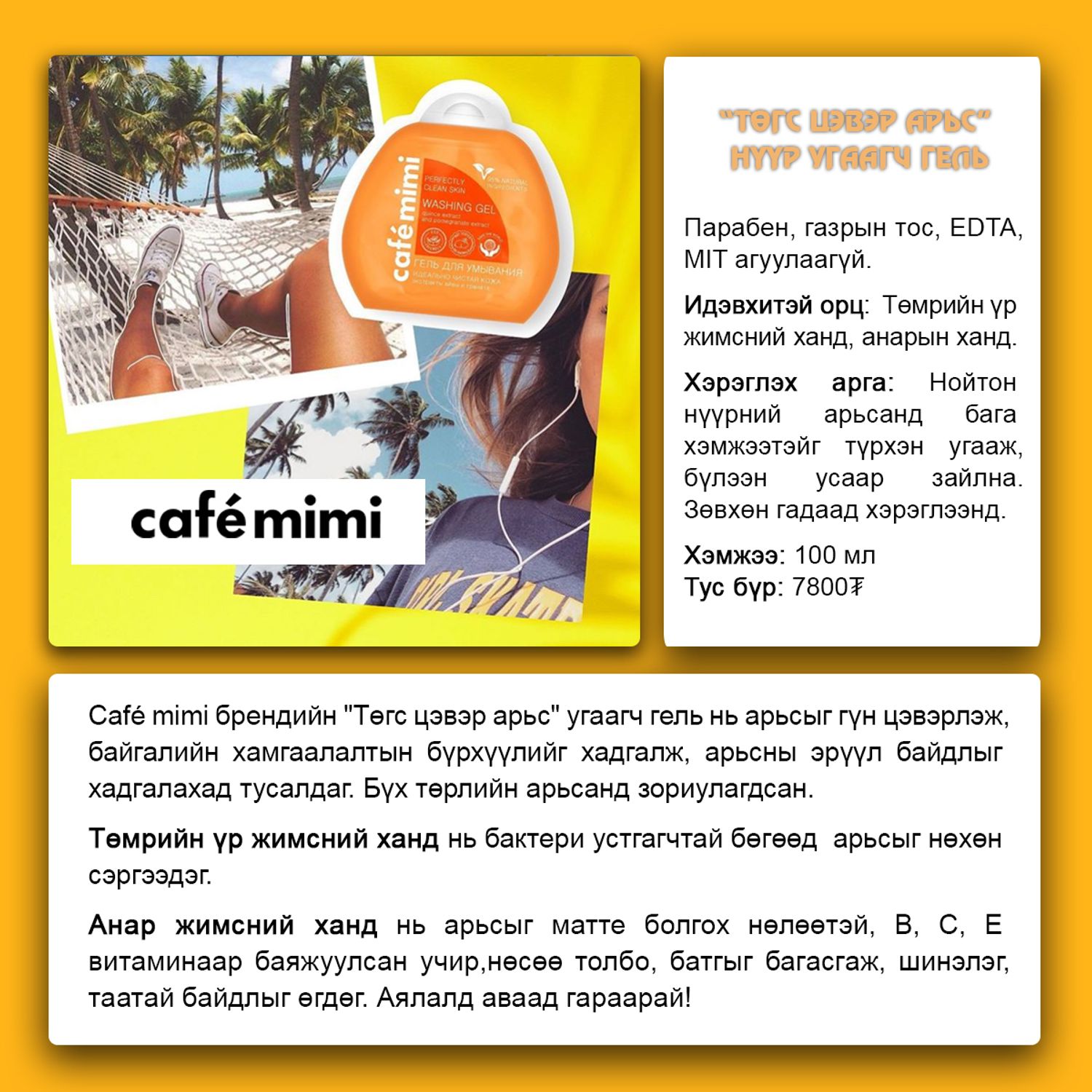 Танилцуулга: Café mimi брендийн "Төгс цэвэр арьс" угаагч гель нь арьсыг гүн цэвэрлэж, байгалийн хамгаалалтын бүрхүүлийг хадгалж, арьсны эрүүл байдлыг хадгалахад тусалдаг. Бүх төрлийн арьсанд зориулагдсан.